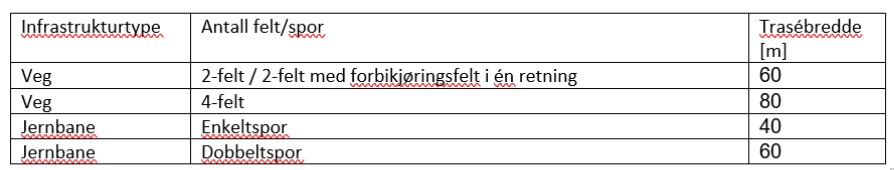 Ved beregning av klimagassutslippene i tidlig fase skal det ikke differensieres mellom permanente og midlertidige arealbeslag. Klimagassutslipp skal beregnes som om alt arealbeslag vil være permanent, pga. standardverdiene på arealbeslag allerede tar høyde for et visst midlertidig beslag (ref. metoden beskrevet av transportvirksomhetene og Miljødirektoratet). Omfanget av arealinngrep i tidlig fase skal kvantifiseres basert på verdier i Tabell 6:1. Digital trasélinje som representerer den/de aktuelle traséalternativene danner senterilinjen for trasébredden.