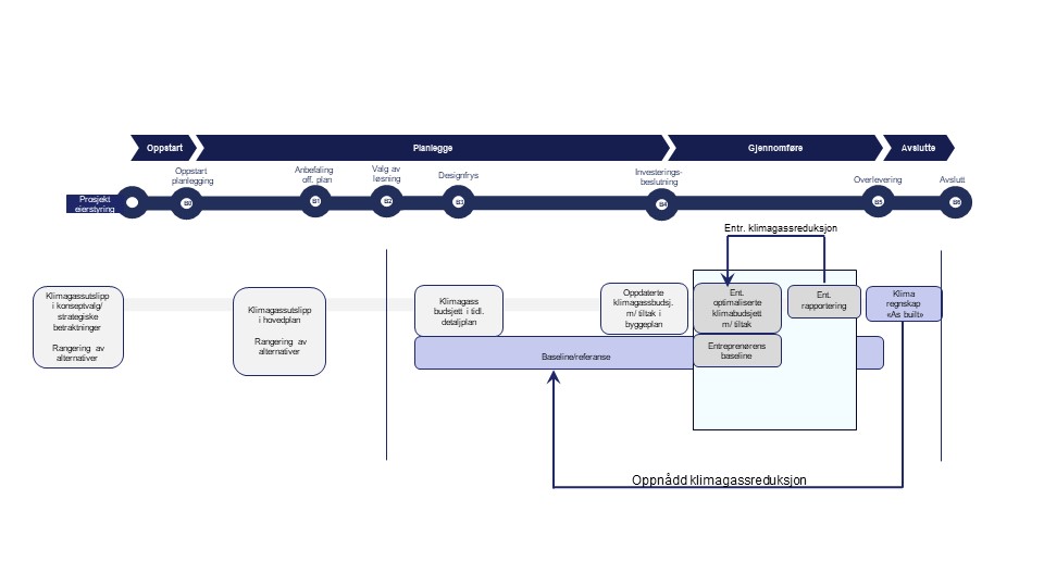 Byggeplan/ konkurransefase | I byggeplanen jobbes det i detaljprosjekteringen videre med tiltak for å redusere prosjektets klimagassutslipp. Oppdatert klimabudsjett kan inkludere planlagte tiltak for utslippsreduksjoner. Valg av tekniske løsninger og andre valg som påvirker prosjektets samlede utslipp, skal dokumenteres. Byggeplanen gir videre et grunnlag for å innarbeide prosjektspesifikke klimakrav i konkurransegrunnlag og kontrakt. Bruk av klimagassberegninger i byggeplan og konkurransefase er avhengig av prosjektets entrepriseform og anskaffelsesstrategi. |